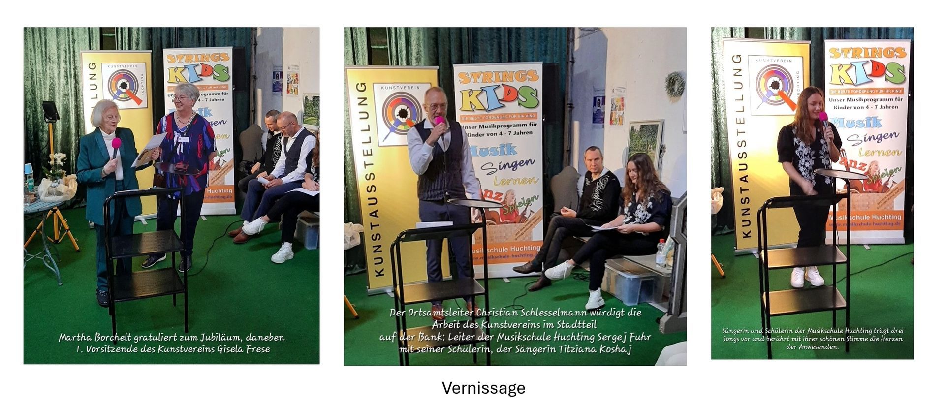 Es begann sehr feierlich mit der Vernissage. Der Ortsamtsleiter Christian Schlesselmann aus Huchting hielt die Laudatio auf die langjährige, ehrenamtliche Arbeit der Vereinsmitglieder in der Region und erläuterte viele Netzwerk Zusammenhänge, die in Huchting gut funktionieren und an denen der Kunstverein Anteil hat. Musikalischen Genuss erhielten die Gäste durch die Musikschule Strings aus Huchting. Ihr Leiter Sergej Fuhr präsentierte seine Schülerin, die Sängerin Titziana Koshaj auf der Vernisage. Die 1.Vorsitzende des Kunstvereins, Gisela Frese, würdigte langjährige Mitglieder und Ehrengäste.